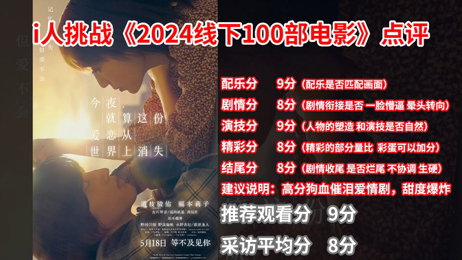 看坐标ip就知道我是真的看过的人,以下来自真实感想:本来和朋友抱着随便看看的态度去的,非大ip+非豪华班底+非大热原作=不敢期待,没想到最后全场都哭的稀里哗啦,包括我朋友身边坐的那位男性,后期的节奏把握非常好,和前期的平稳叙事形成了强烈反差冲击感。画面的美感,男主的透明破碎感都很贴合,泉ちゃん应该是最痛苦的了古川琴音也演出来了。谢谢道枝弟弟让神谷透有了脸,谢谢全剧组的努力让我们看到了今夏最灿烂的虐恋。能在夏休一众大片包围下3周突破10亿票房+动员100万人次,对于这种小成本恋爱电影真的很不错了!反正超出了我的预料,希望大陆能引进看看。记得带新口罩和纸巾(前车之鉴在此) |